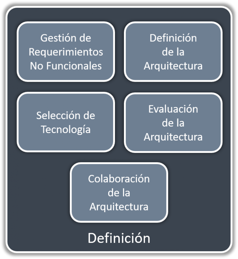 El proceso de definición de la arquitectura parece bastante sencillo. Todo lo que tienes que hacer es descubrir cuáles son los requisitos y diseñar un sistema que los satisfaga. Pero en realidad no es tan simple y el rol de la arquitectura de software puede variar enormemente dependiendo de qué tan comprometido esté y cuán seriamente vea su rol. Como se muestra en el siguiente diagrama, la parte de definición de arquitectura en el rol se puede desglosar en varios elementos diferentes: