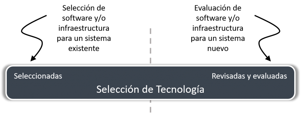- Selección de tecnología. La selección de tecnología suele ser un ejercicio divertido, pero tiene una serie de desafíos cuando se consideran los costos, las licencias, las relaciones con los proveedores, la estrategia tecnológica, la compatibilidad, la interoperabilidad, el soporte, la implementación, las políticas de actualización, los entornos de usuario final, etc. La suma de estos factores a menudo puede hacer que una tarea simple de elegir algo como una tecnología de cliente enriquecida sea una pesadilla completa. Y luego está la cuestión de si las tecnologías realmente funcionan. La selección de tecnología tiene que ver con la gestión del riesgo: reduciendo el riesgo donde hay alta complejidad o incertidumbre e introduciendo el riesgo donde hay beneficios para tener. Las decisiones tecnológicas deben tomarse teniendo en cuenta todos los factores, y todas las decisiones tecnológicas deben revisarse y evaluarse. Esto incluye los principales bloques de construcción para un proyecto de software hasta las bibliotecas y los frameworks que se introducen durante el desarrollo. Si estás definiendo una arquitectura, también debes estar seguro que las elecciones de tecnología que se están haciendo son las correctas. Nuevamente, hay una gran diferencia entre evaluar la tecnología para un nuevo sistema y agregar tecnología a un sistema existente.