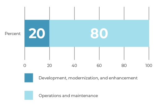 En muchas organizaciones, el 80 por ciento del presupuesto de TI se gasta en Operaciones y Mantenimiento. Este gasto incluye principalmente sistemas antiguos y, en muchos casos, obsoletos que plantean problemas de eficiencia, ciberseguridad y riesgo de misión. Sólo el 20 por ciento del presupuesto de TI se asignó a Desarrollo, Modernización y Mejoras (DME).